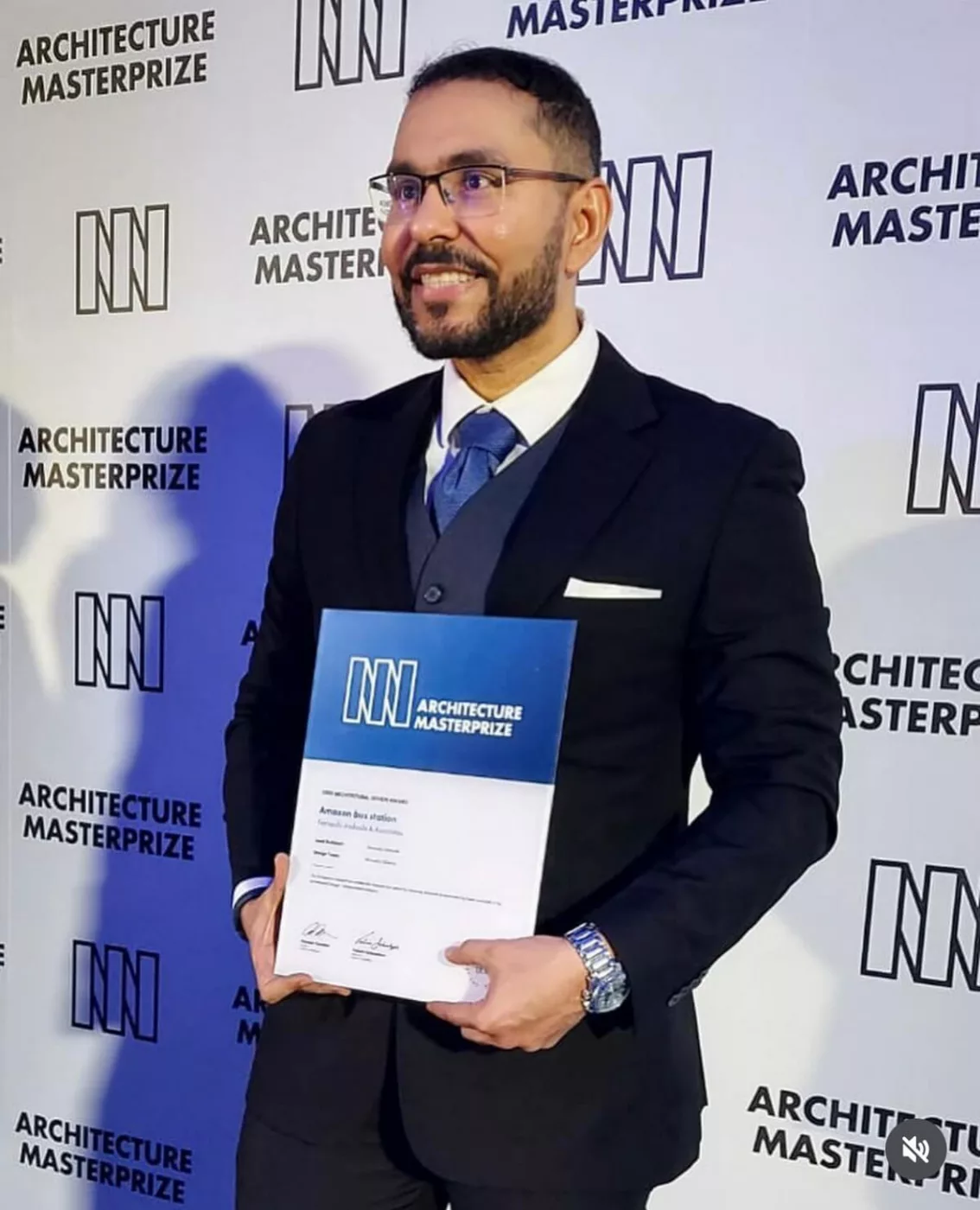 Fernando Andrade of Fernando Andrade & Associates celebrates with joy and pride as he receives the prestigious AMP award at the event for the remarkable architectural ingenuity of “Amazon Bus Station” in Transportation.